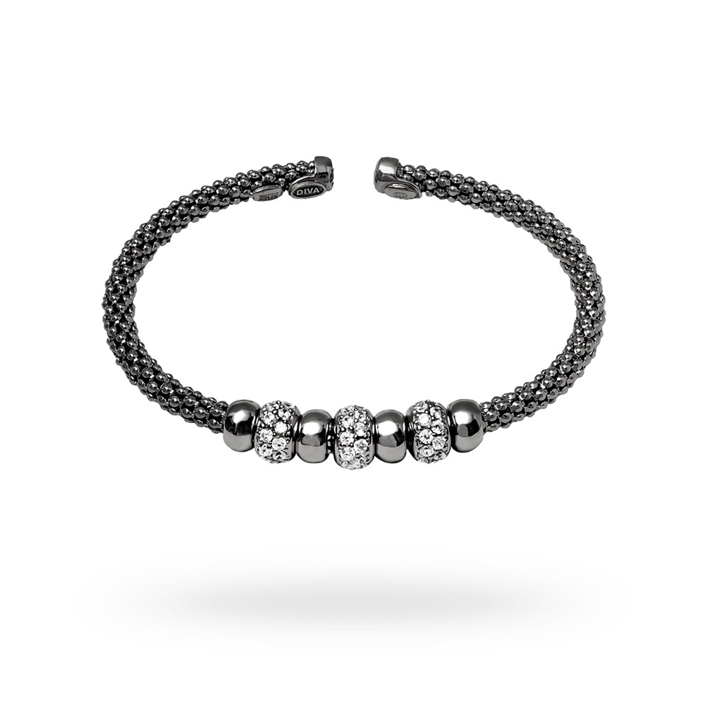• Bracciale semirigido in argento composto da filo in maglia coreana del diametro di 4,5 mm e centrale composto da elementi in argento e zirconi. Designed & Made in Italy. Finito a mano.
